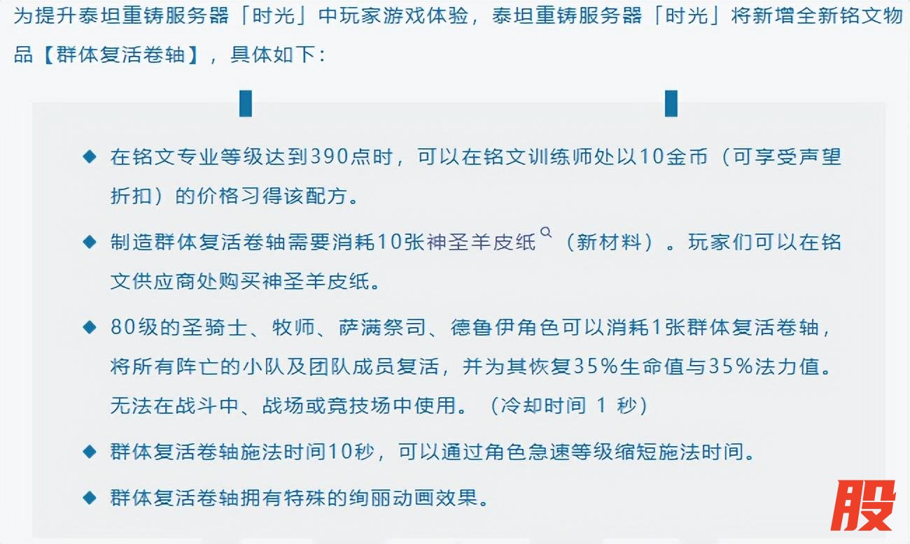 相信大家在体验过怀旧服熊猫人之后,都会发出这样的感叹:“群体复活真乃神技”。不错,它给予了所有打本团队极大的便利。于是乎,就有玩家提议给时光服也整一个!话音刚落,官方就在今天发布蓝贴新增铭文物品“群体复活卷轴”,这意味着时光服玩家以后再也不用挨个复活了。